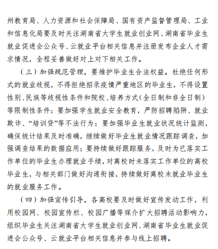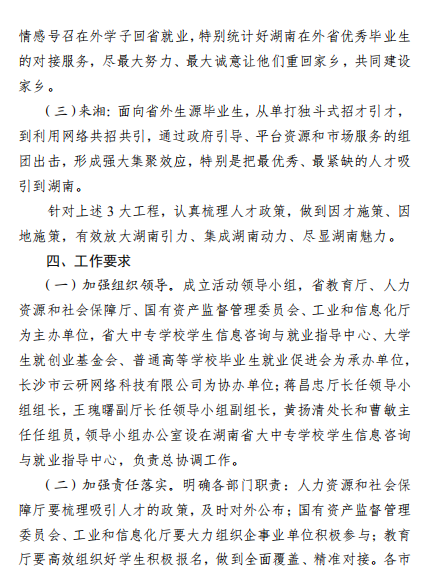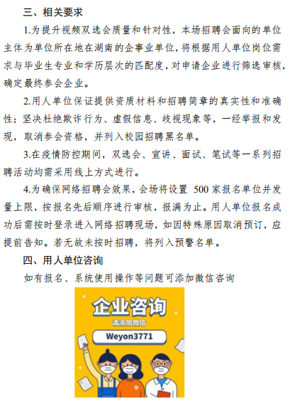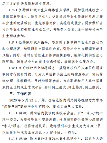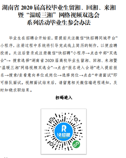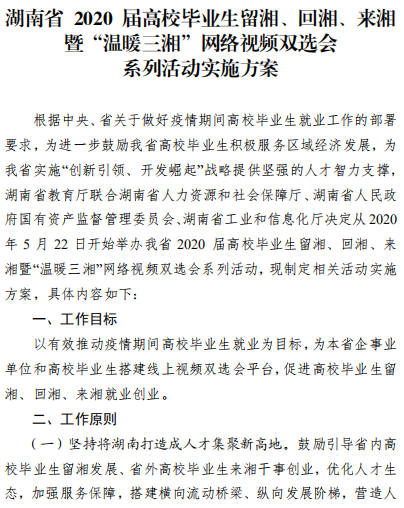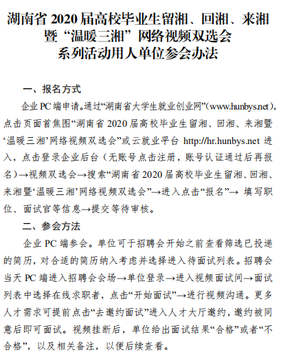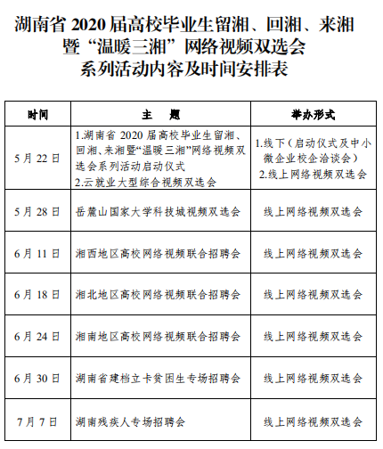 活动目的 以有效推动疫情期间高校毕业生就业为目标,为本省企事业 单位和高校毕业生搭建线上视频双选会平台,促进高校毕业生留湘、回湘、来湘就业创业。 组织机构 主办单位: 湖南省教育厅 湖南省人力资源和社会保障厅 湖南省人民政府国有资产监督管理委员会 湖南省工业和信息化厅 承办单位: 湖南省大中专学校学生信息咨询与就业指导中心 湖南省大学生就创业基金会 湖南省普通高等学校毕业生就业促进会 协办单位: 长沙市云研网络科技有限公司 活动领导小组 组 长: 蒋昌忠 湖南省教育厅党组书记、厅长、工委书记、省委教育工作领导小组秘书组组长 副组长: 王瑰曙 湖南省教育厅党组副书记、副厅长、工委 副 书记、省委教育工作领导小组秘书组副组长 黄赞佳 湖南省人力资源和社会保障厅党组副书记、 副厅长 卢光祖 湖南省人民政府国有资产监督管理委员会 一级巡视员 熊 琛 湖南省工业和信息化厅党组成员、总经济师 成 员: 黄扬清 湖南省教育厅学生处处长 曹 敏 湖南省大中专学校学生信息咨询与就业指 导中心主任 李日新 湖南省人力资源和社会保障厅就业促进与 失业保险处处长 胡 谦 湖南省人民政府国有资产监督管理委员会 三级调研员 孙 丹 湖南省工业和信息化厅中小企业服务指导处主任科员 此次活动领导小组办公室设在湖南省大中专学校学生信息咨询与就业指导中心,负责总协调工作。 活动内容及时间安排 活动采取线上网络视频双选会,线下中小微企业校企座谈会 形势举办。(具体详见附件 2) 参会对象 省内各企事业用人单位、湖南省普通高等院校毕业生 总体要求 (一)加强组织领导 湖南省人力资源和社会保障厅、湖南省人民政府国有资产监 督管理委员会、湖南省工业和信息厅负责组织本地区企事业单位 积极参与,湖南省教育厅负责引导高校组织好学生积极报名,及 时关注湖南省大学生就业创业网、湖南省毕业生就业促进会公众 号、云就业平台相关信息。 (二)加大宣传引导 各普通高校要及时做好宣传发动工作,利用校园网、校园宣 传栏、校园广播等媒介扩大招聘活动影响力,组织毕业生关注湖 南省大学生就业创业网、湖南省毕业生就业促进会公众号、云就 业平台相关信息并参与线上招聘。 联系方式 湖南省教育厅 联 系 人: 鲁光杰 联系电话:0731-84715492 湖南省人力资源和社会保障厅 联 系 人: 李日新 联系电话:0731-84900025 湖南省人民政府国有资产监督管理委员会 联 系 人: 胡 谦 联系电话:0731-82211403 湖南省工业和信息化厅 联 系 人: 孙 丹 联系电话:0731-88955536 湖南省大中专学校学生信息 咨询与就业指导中心 联 系 人:王 彬 联系电话:0731-82116068 长沙市云研科技网络有限公司 联 系 人:孔德强 联系电话:15580841652 附件 湖南省 2020 届高校毕业生留湘、回湘、来湘暨“温 暖三湘”网络视频双选会系列活动实施方案 湖南省 2020 届高校毕业生留湘、回湘、来湘暨“温暖 三湘”网络视频双选会系列活动内容及时间安排表 湖南省 2020 届高校毕业生留湘、回湘、来湘暨“温暖 三湘”网络视频双选会系列活动用人单位参会办法 湖南省 2020 届高校毕业生留湘、回湘、来湘暨“温 暖三湘”网络视频双选会系列活动毕业生参会办法 湖南省教育厅 湖南省人力资源和社会保障厅 湖南省工业和信息化厅 湖南省任命政府国有资产监督管理员委员会 2020年4月28日 附件1 附件2 附件3 附件4